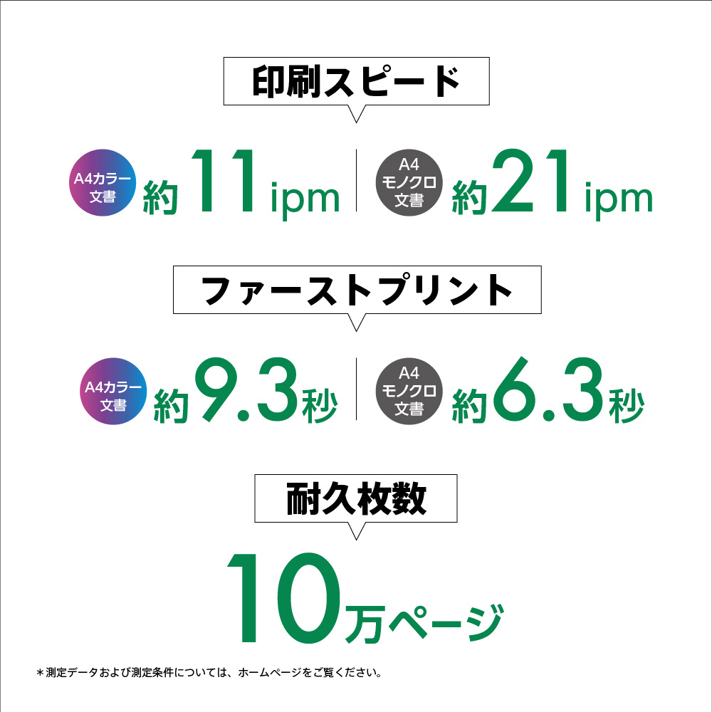 | 印刷速度 | カラー:約11ipm(A4縦)/最速:約21枚/分、モノクロ:約21ipm(A4縦)/最速:約35枚/分 |