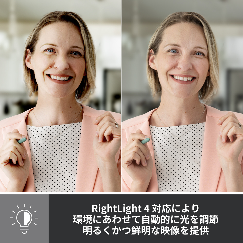 フルHD 1080pに対応した卓越した高画質によって、被写体を含めた会議の参加者全員を鮮明な映像で届けます。自動光補正のRightLight 4 動画照明技術を採用したことで自動的に照明環境を調節し、光量が足りない条件下でも被写体をはっきりと映します。また自動フレーミングを搭載し、会議中に立ったり移動したりしても、フレームから外れることなく、常に画面の中心に捉えます*。