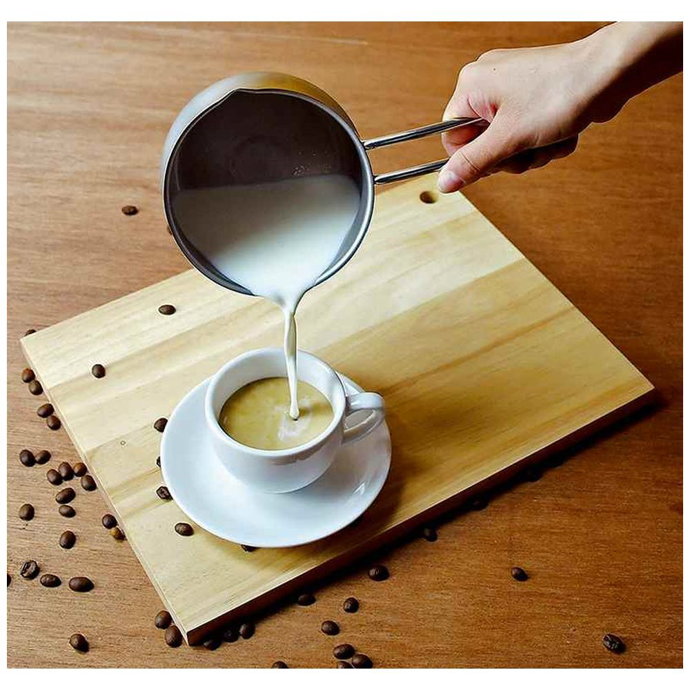 ステンレス製のつぼ型ミルクパンは、少量の温めに最適です。