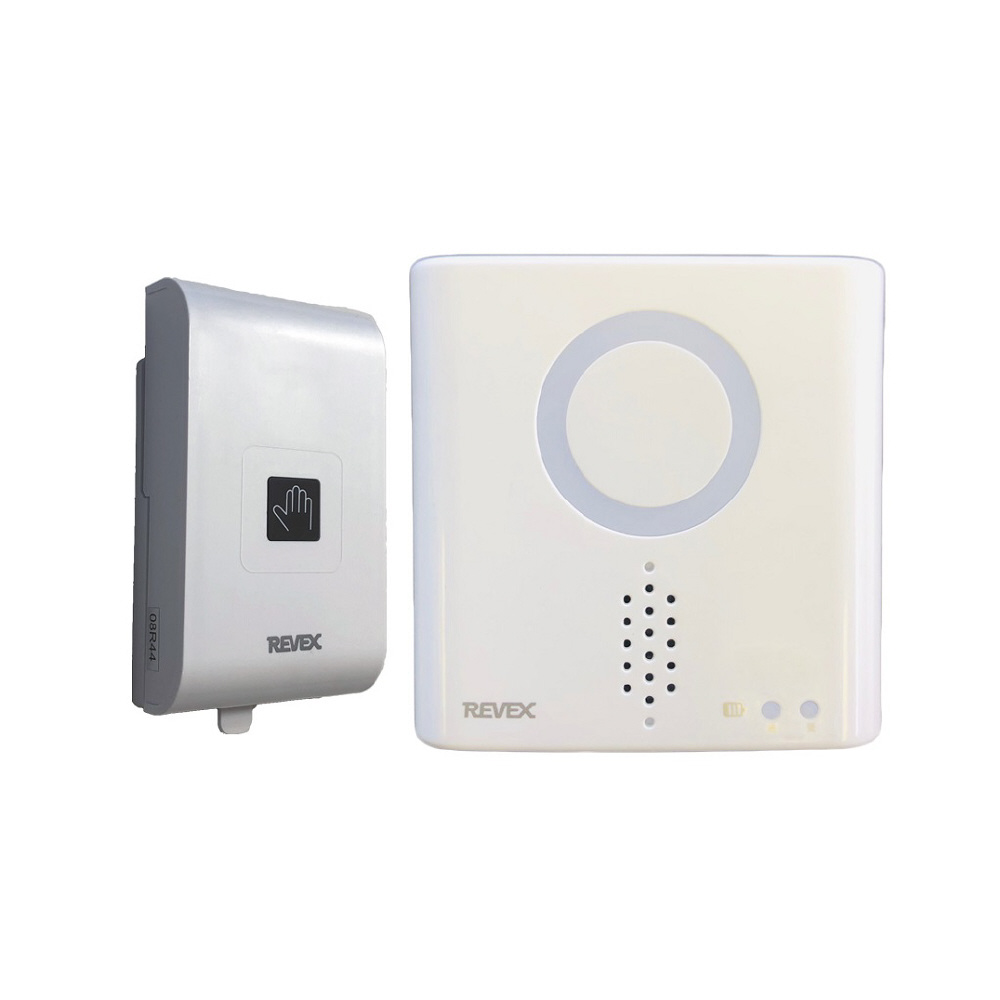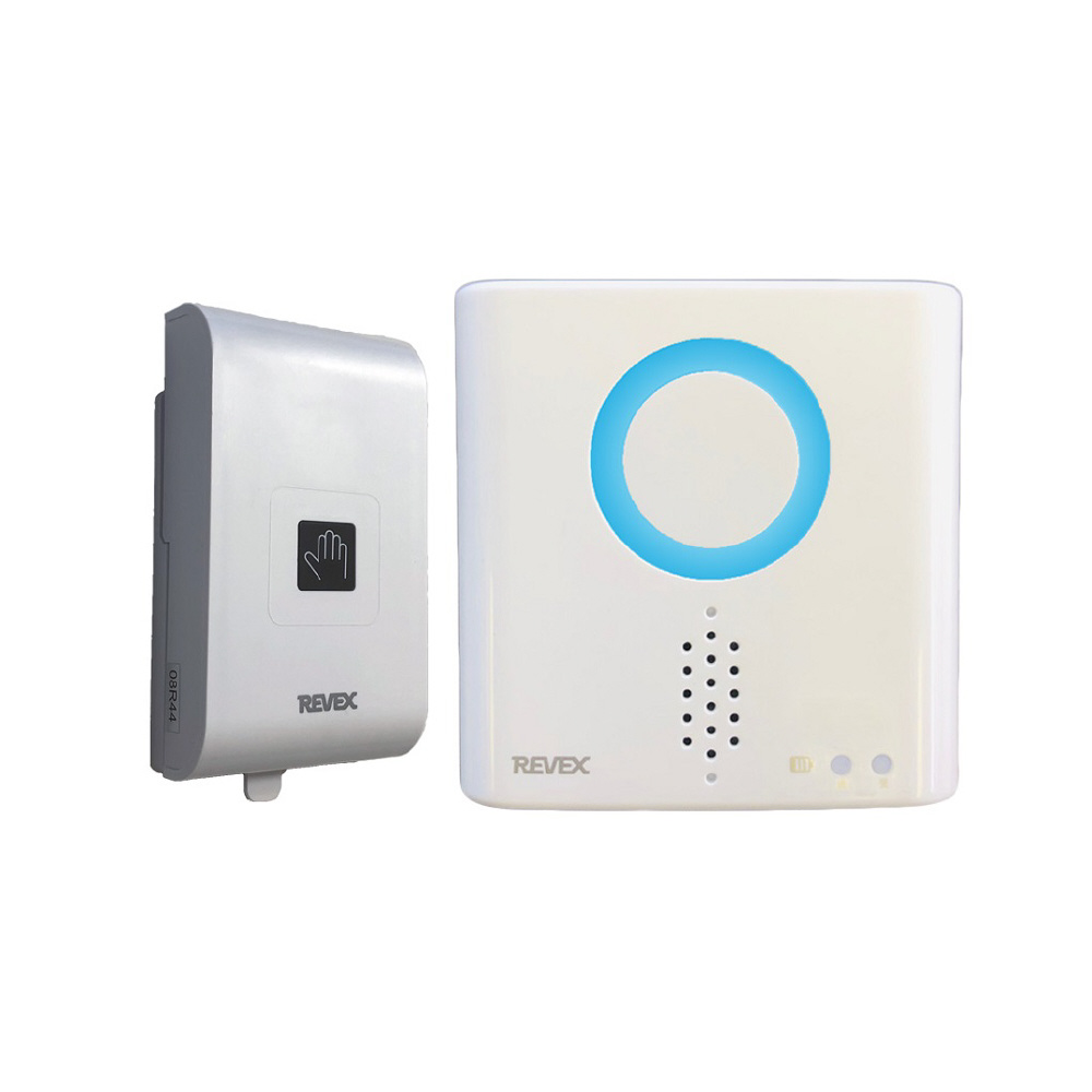 送信機に手をかざすとセンサーが感知し、離れた場所にある受信機が光とチャイム音でお知らせします。
