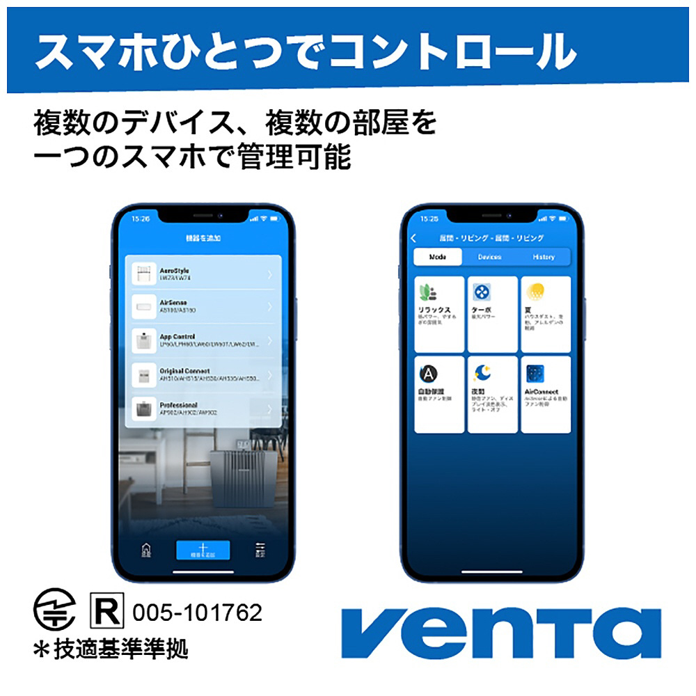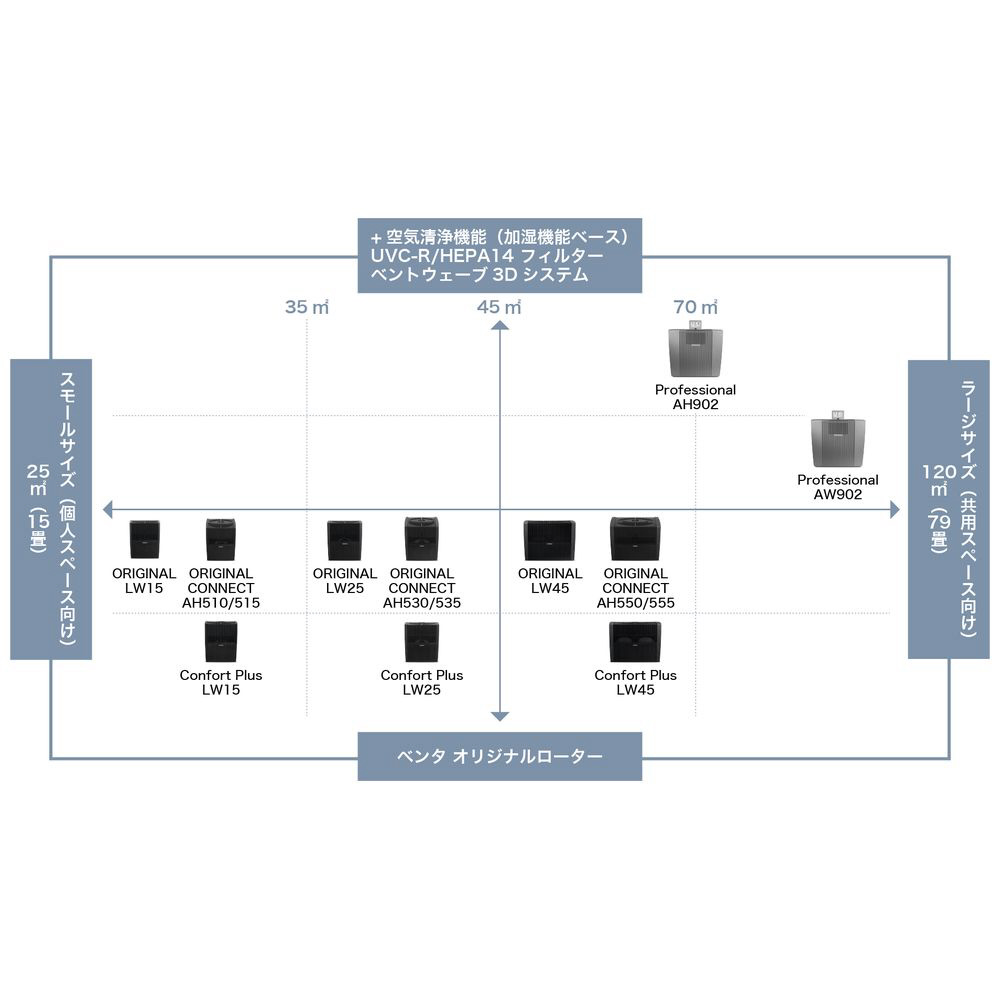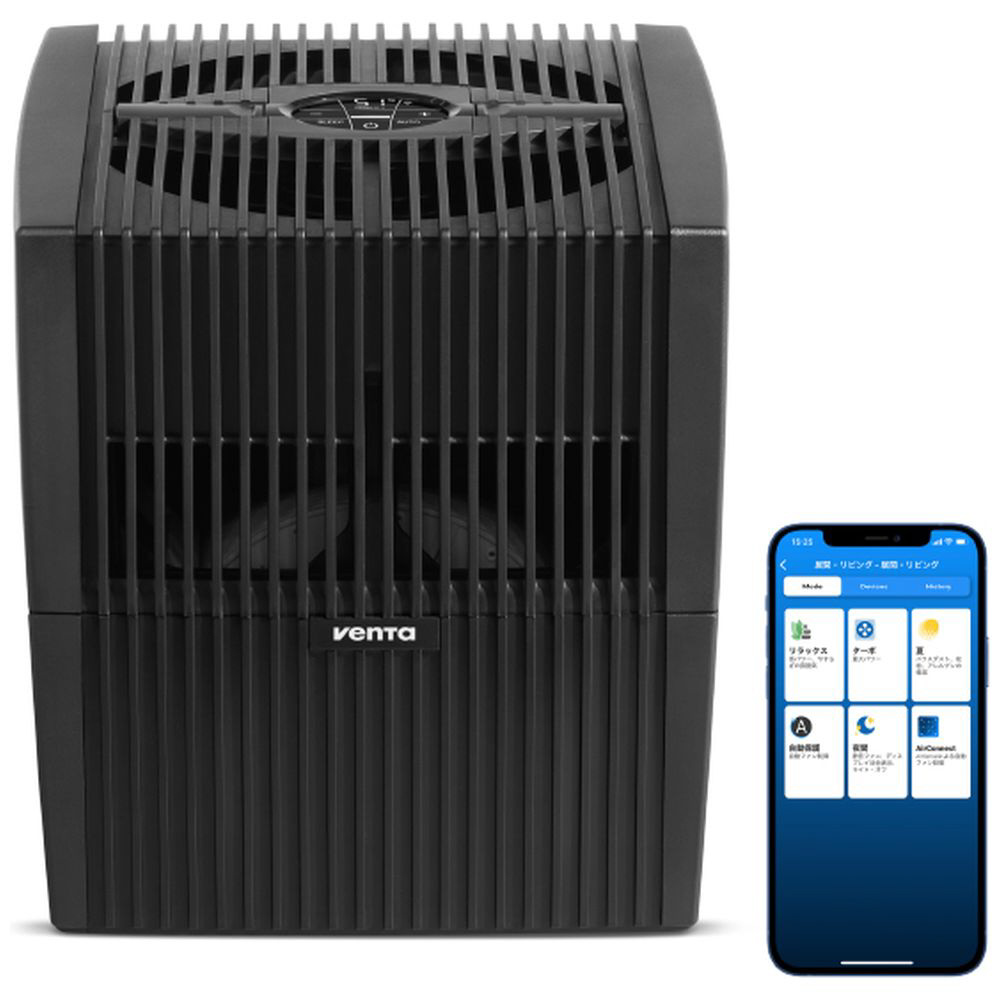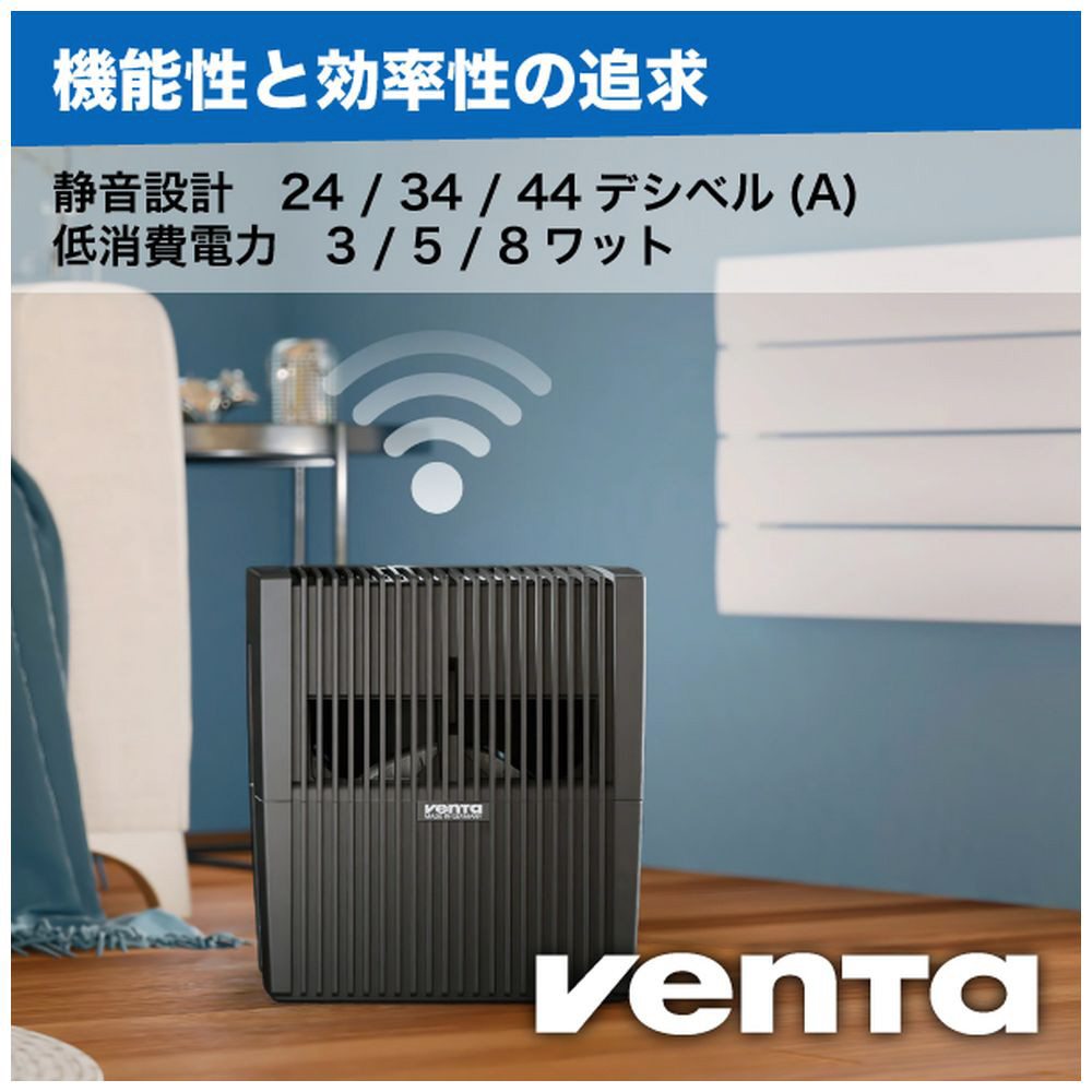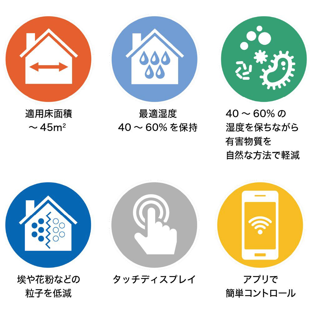 水道水を使用し空気中へ水の小さな粒子を循環させ、ゴミやアレルギー物質など微細な物質を包み、タンク内へ循環、低減させます。