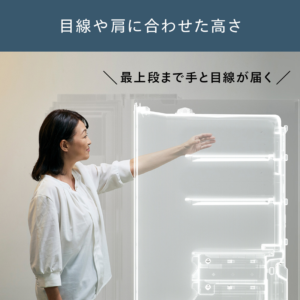 幅を広くすることで、暮らしを支えられる十分な容量を保ったまま、見渡しやすい庫内を実現。