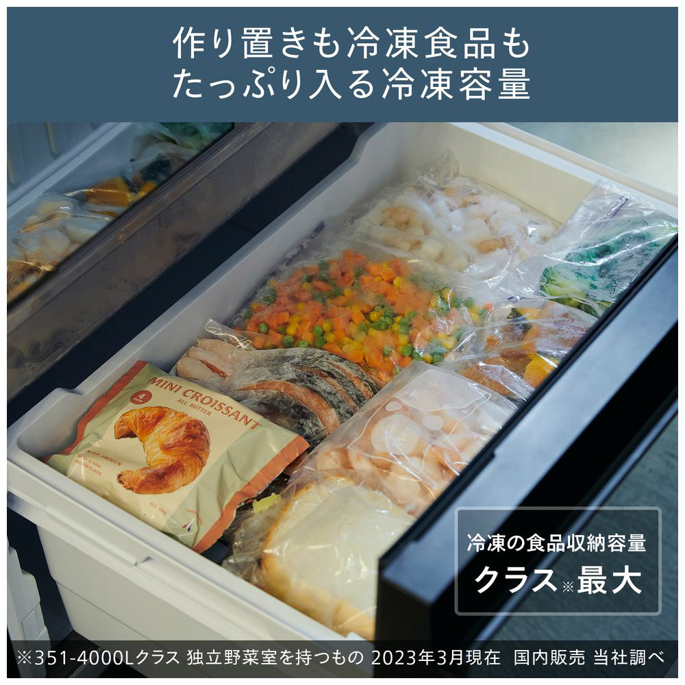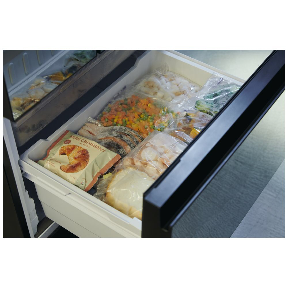 冷凍容量は、クラス* 最大の約103リットル。たくさん入れても、食品が見やすく取り出しやすいように、腰に合わせたちょうどいい高さに設計されています。