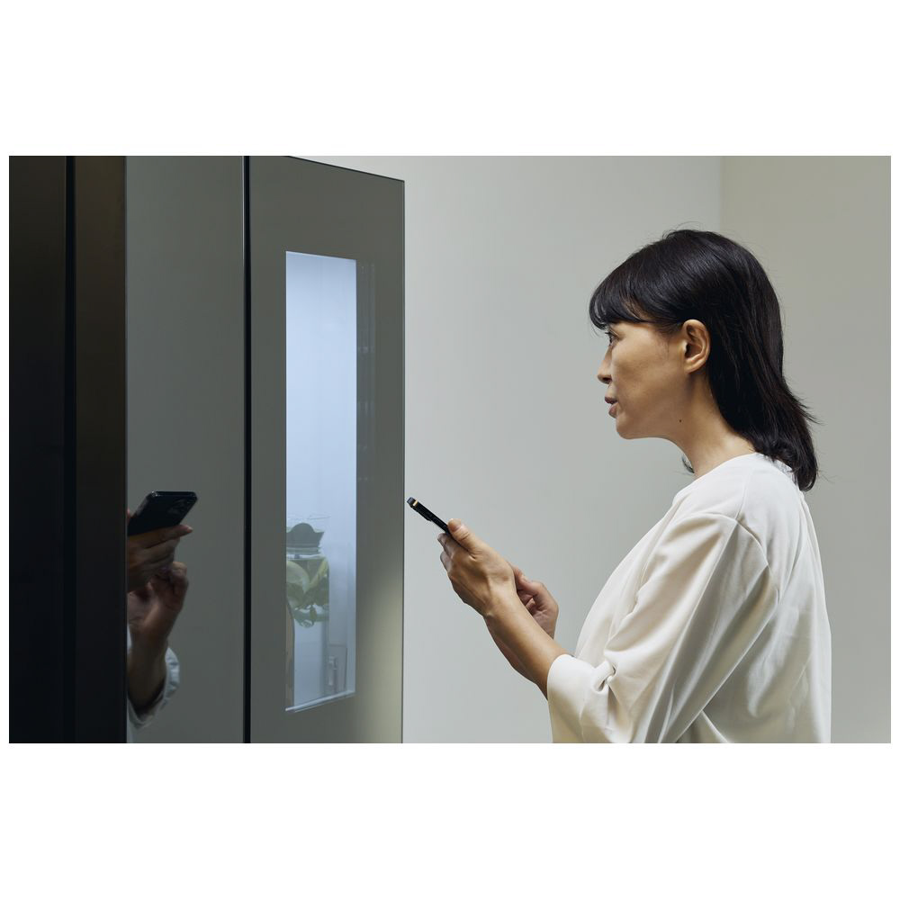 ドアについたセンサーに軽く触れると、冷蔵庫の扉に搭載されたハーフミラーが透けて、