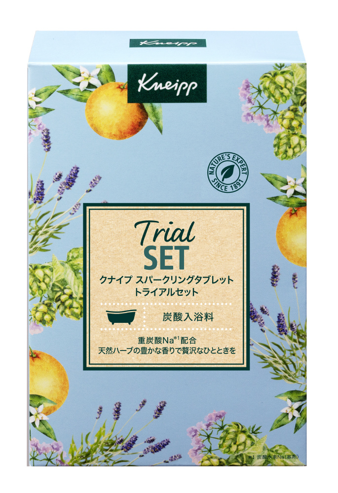 天然ハーブの豊かな香りで贅沢なひとときを。クナイプの炭酸入浴料 スパークリングタブレットの3種類を組み合わせたセット。きめ細やかな炭酸の泡と天然ハーブの贅沢な香りを毎日の気分にあわせて楽しめます。