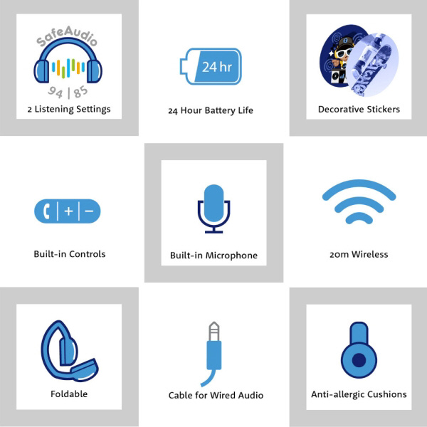 クールなデュアルトーンデザインに加え、子供たちがヘッドホンを通して個性を演出できるようにデコレーションステッカーが付属しています。
