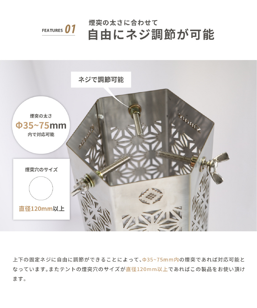 【煙突の太さに合わせて自由にネジ調整が可能】