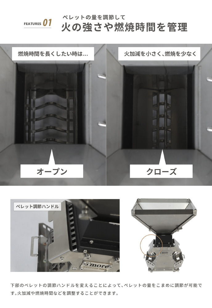 下部のペレット調整ハンドルを変えることによって、ペレットの量をこまめに直性が可能です。