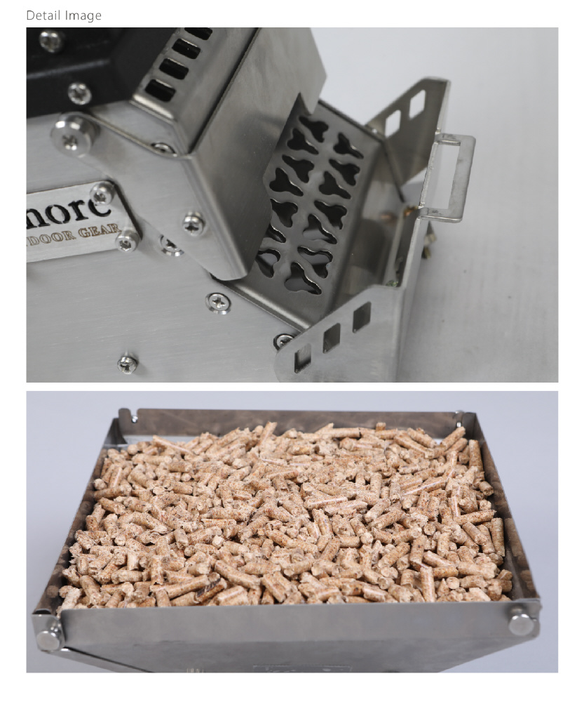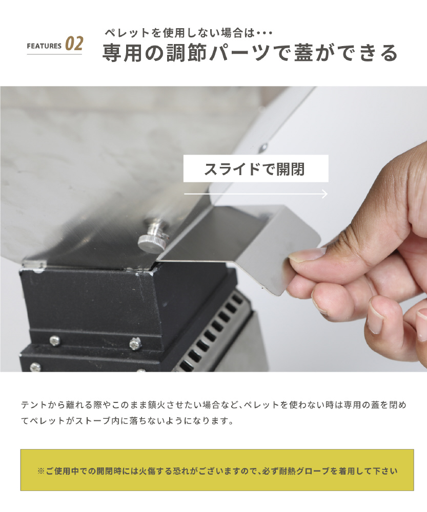 テントから離れる際やこのまま鎮火させたい場合など、ペレットを使わない時は専用の蓋を閉めてペレットがストーブ内に落ちないようになります。