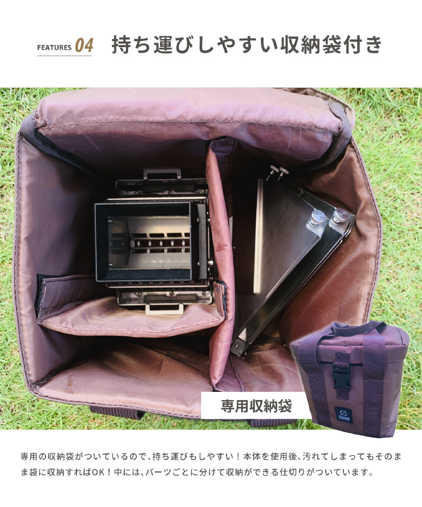 専用の収納袋が付いているので、持ち運びもしやすい!本体を使用後、汚れてしまってもそのまま袋に入れて収納すればOK!中にはパーツごとに分けて収納できる仕切りが付いています。