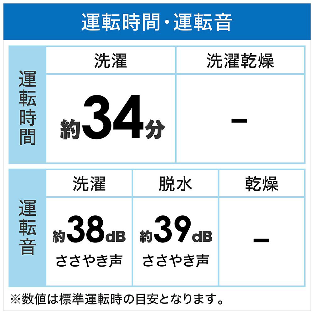 ※2 運転音の表示は一般社団法人日本電機工業会洗濯機性能評価基準による。深夜のお洗濯は近隣へのご配慮をお願いします。