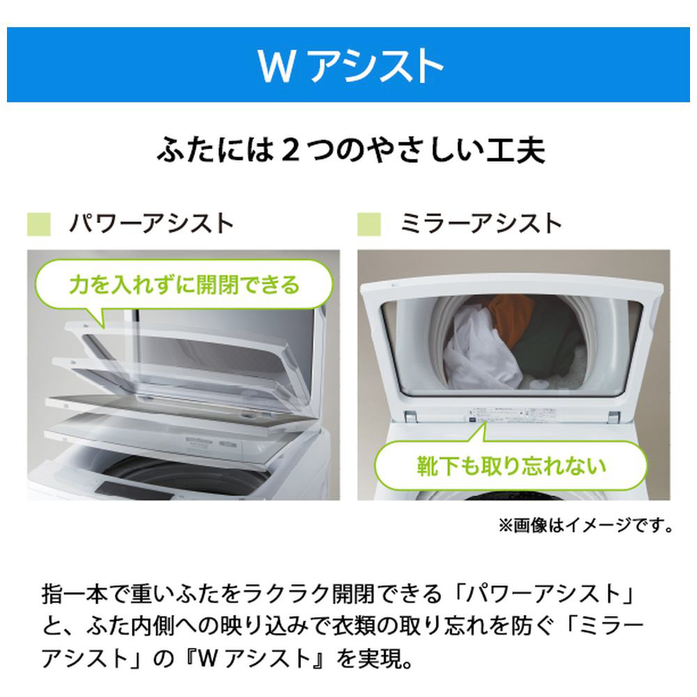 指一本で重いふたをラクラク開閉できる「パワーアシスト」と、ふた内側への映り込みで衣類の取り忘れを防ぐ「ミラーアシスト」の『Wアシスト』を実現。