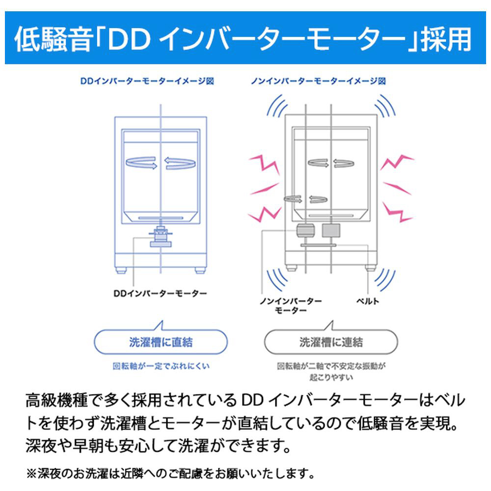 高級機種で多く採用されているDDインバーターモーターはベルトを使わず洗濯槽とモーターが直結しているので低騒音を実現(洗い時38dB・脱水時39dB※2)。帰宅後の夜洗濯や、赤ちゃんがいるご家庭でも安心して洗濯ができます。