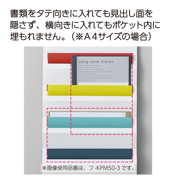 ●ポケット設計/書類をタテ向きに入れても見出し面を隠さず、横向きに入れてもポケット内に埋もれません。※A4サイズの場合●薄型設計/書類を入れてもかさばりにくい薄型設計なので、省スペースで使うことができます。