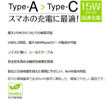 USB Type-A(オス) - USB Type-C(オス)充電/データ転送ケーブル 1.5m