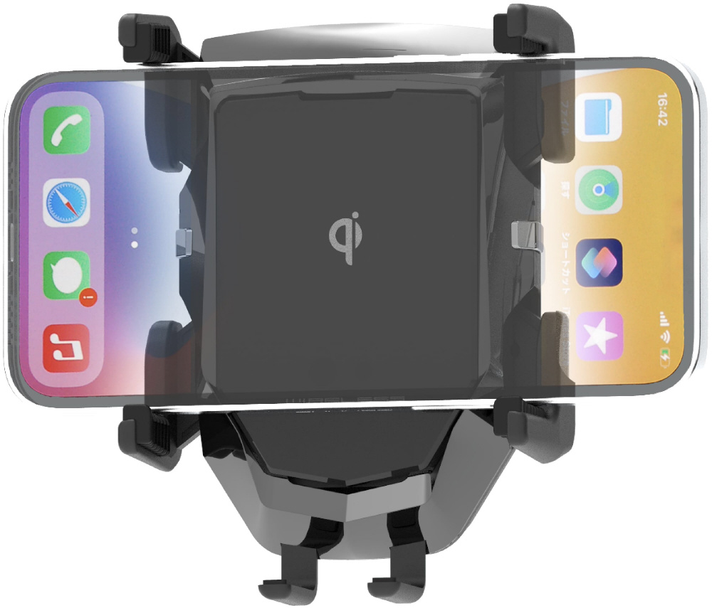 ■Qi対応スマートフォン/iPhoneをホールドしながらワイヤレス充電。急速充電モードで最大10Wによる充電が可能。