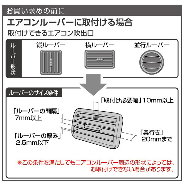 ●付属のクリップと両面テープでエアコンルーバーに取付けることができます。