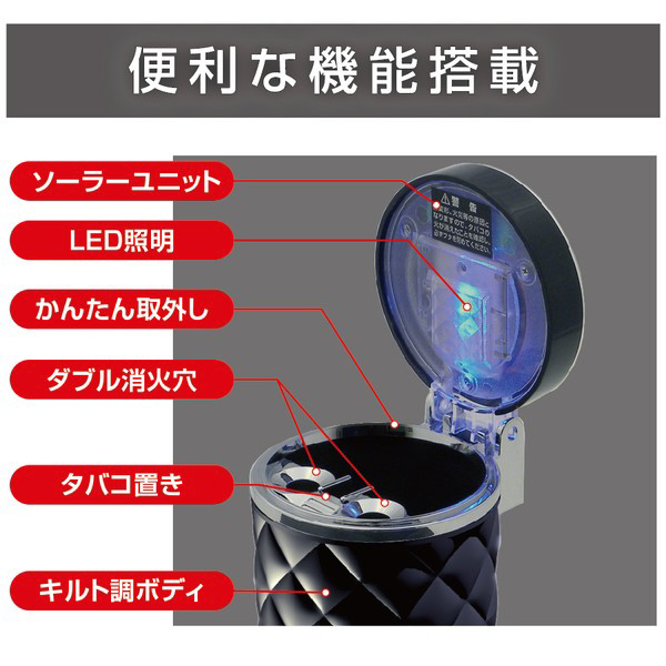 | 商品名 | 車内用品 EXEA(エクセア) 灰皿 ソーラーキルトアッシュ ブラック ドリンクホルダー型 LED付き マットブラック ED233 |