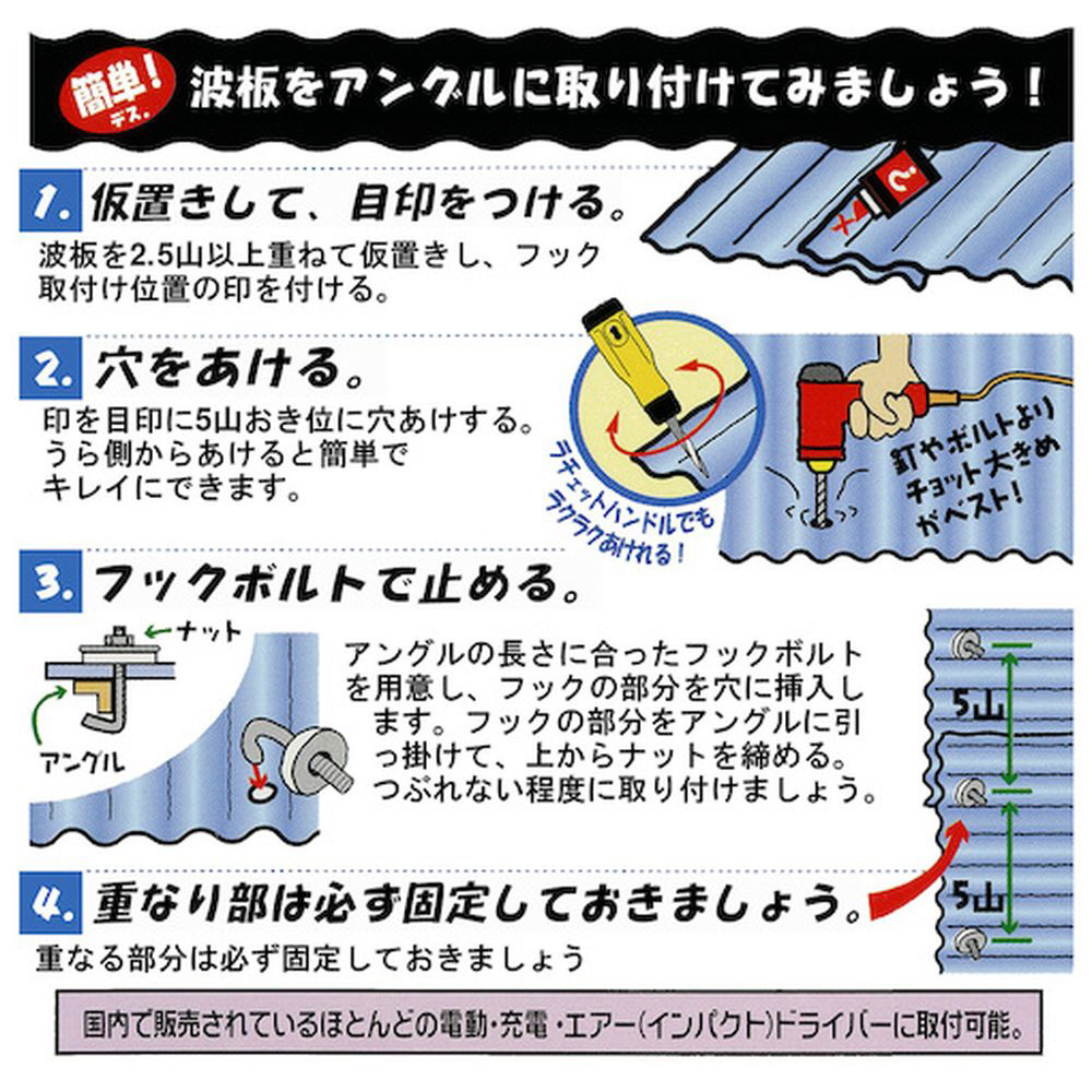 | 注意 | ●回転中の刃部には絶対に手や顔を近づけないでください。●3000回転/分以上の電動工具では使用しないでください。●プリキの波板には使用しないでください。 |