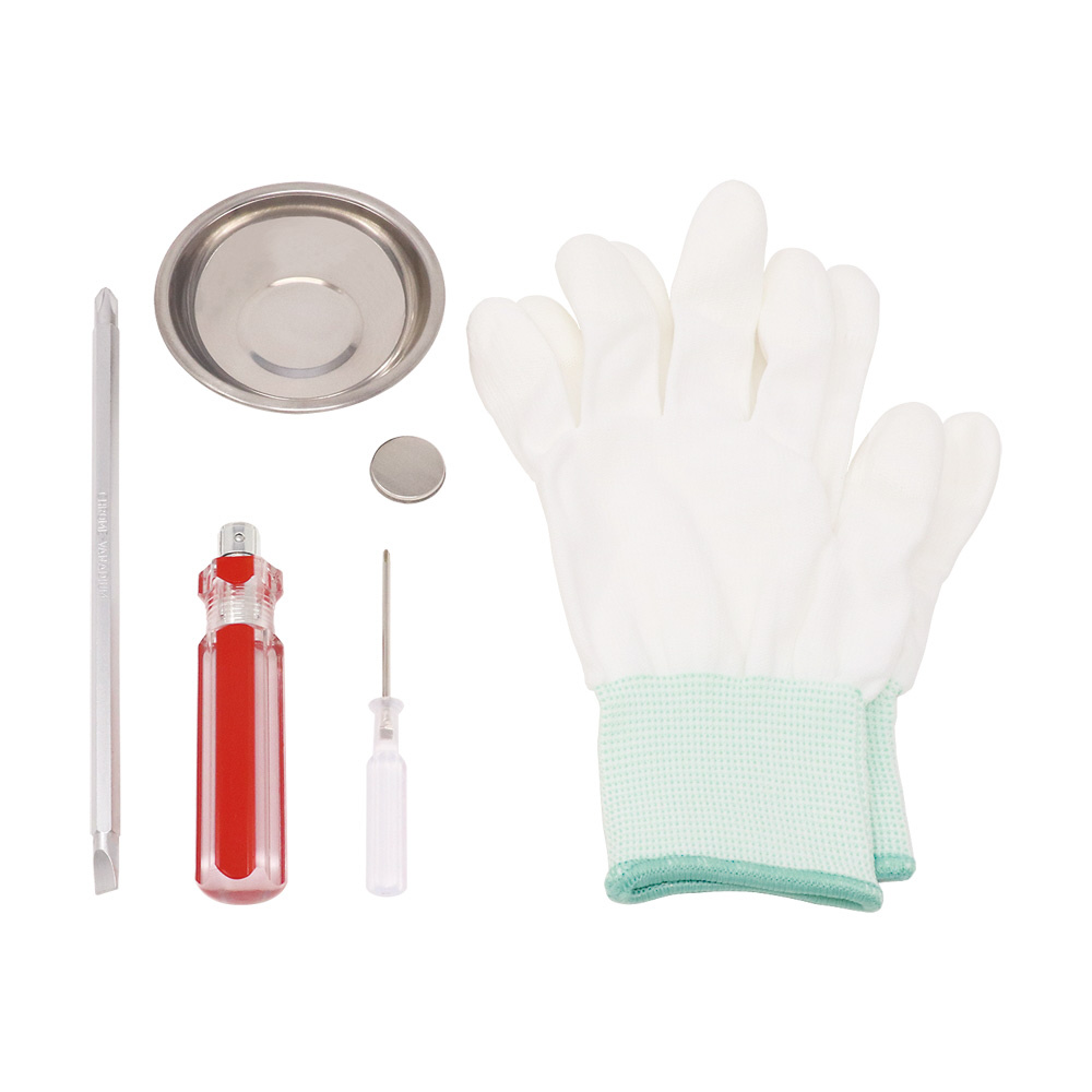 ■差替ドライバー/精密プラスドライバー/マグネットトレイ/静電気防止手袋のセットです。