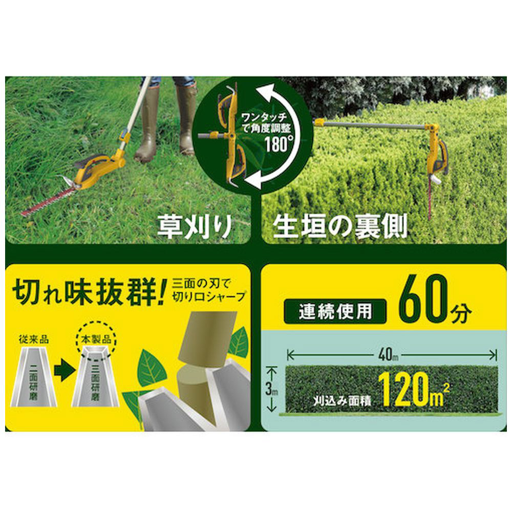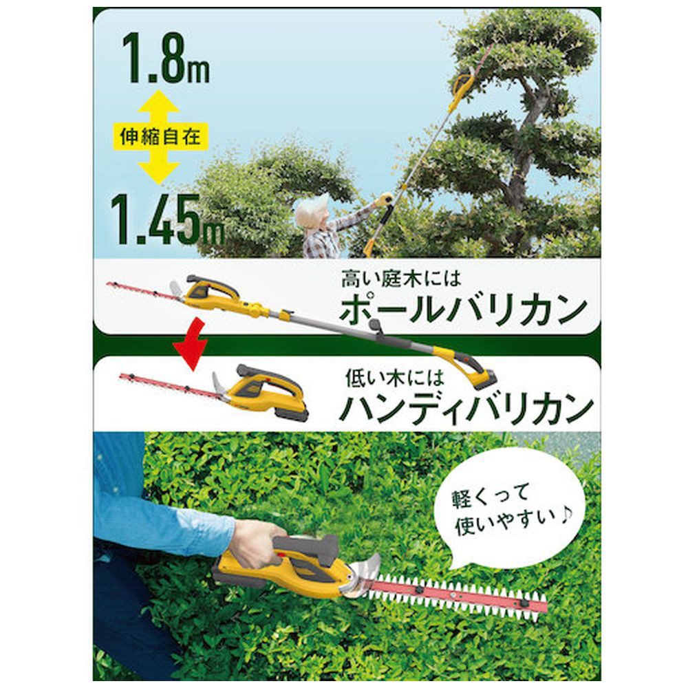 【特長】●手元・中木・下草の剪定がこれ1台で可能です。●本体とポールを外して使えるので、高い庭木にはポールバリカン、低い木にはハンディバリカンと使い分けできます。●刃は三面研磨で切れ味抜群です。