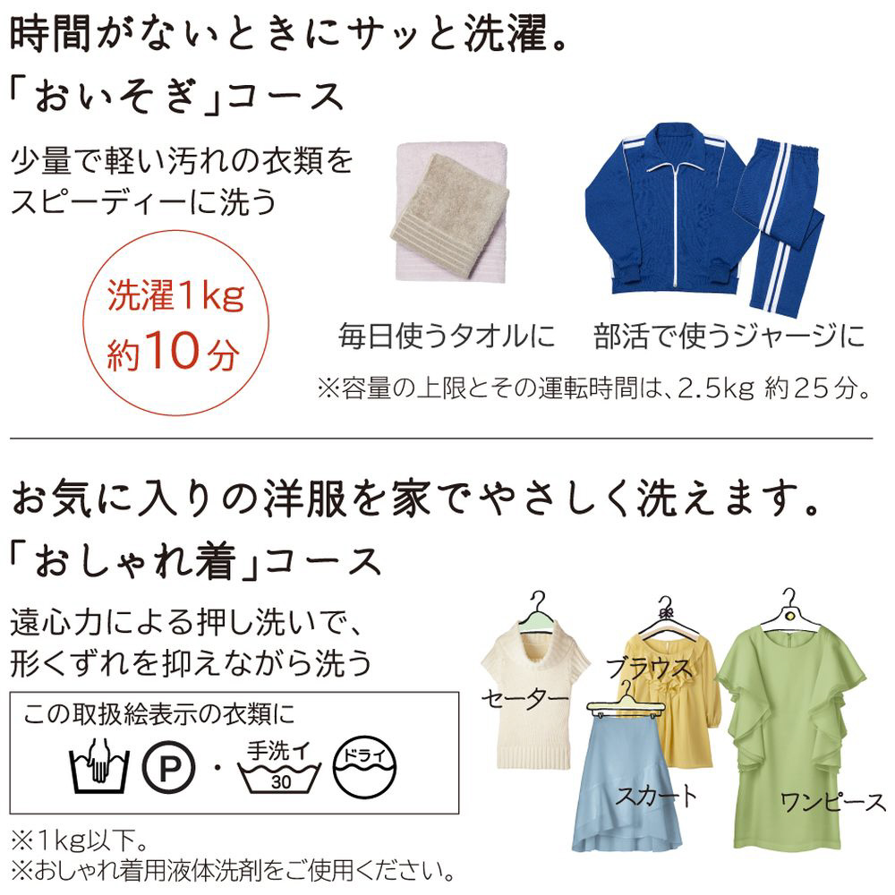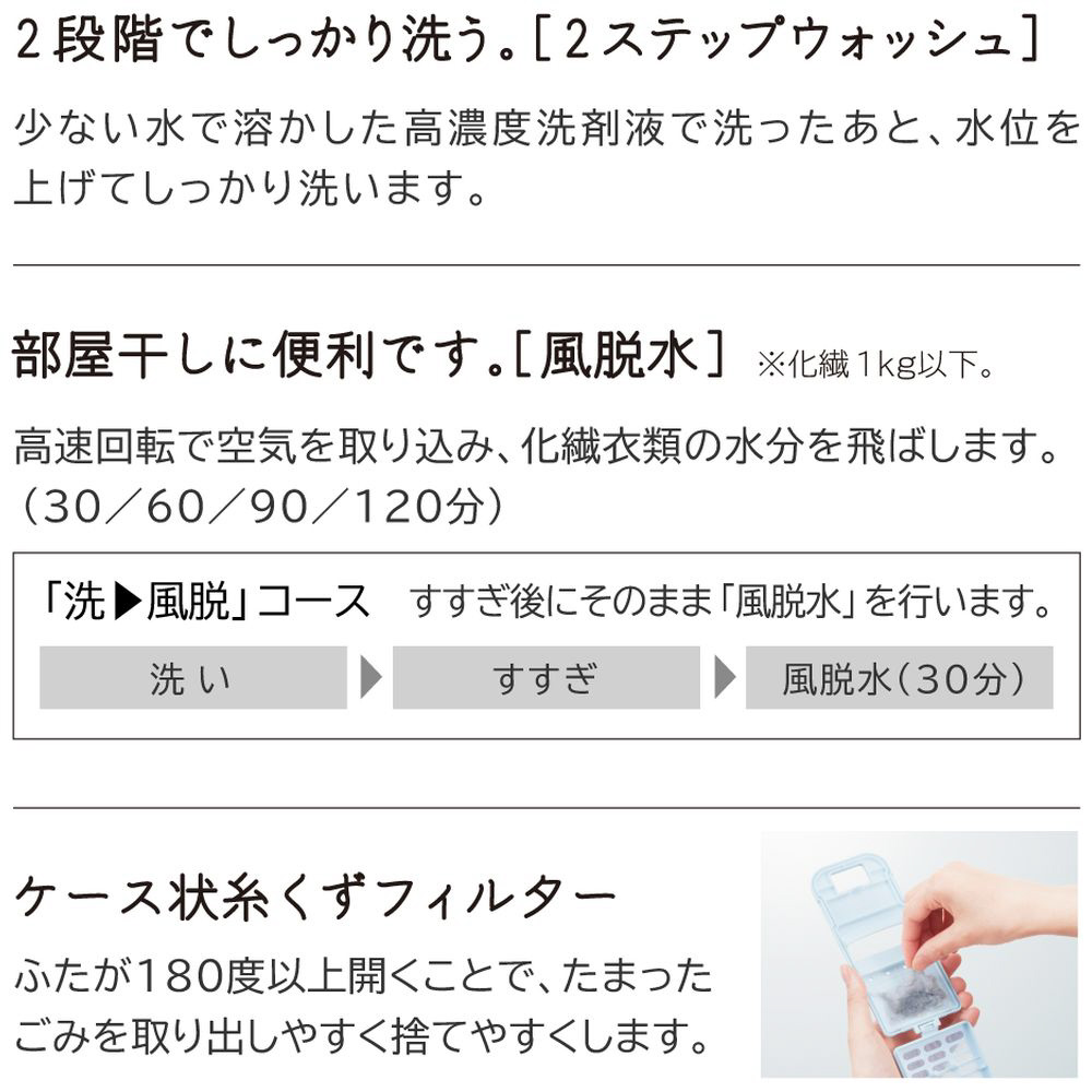 高濃度洗剤液で洗う「2ステップウォッシュ」。干し時間を短縮できる「風脱水」。少量の軽い汚れの衣