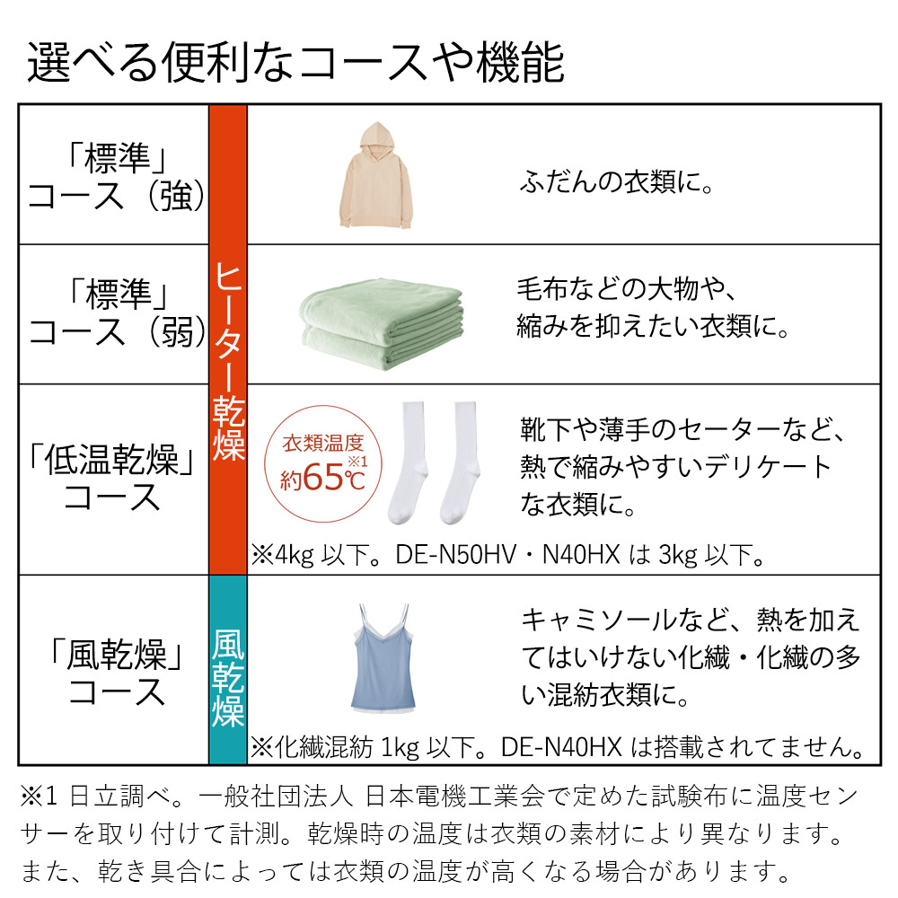 衣類温度約65℃の低温乾燥で、縮みを抑えて乾燥します。