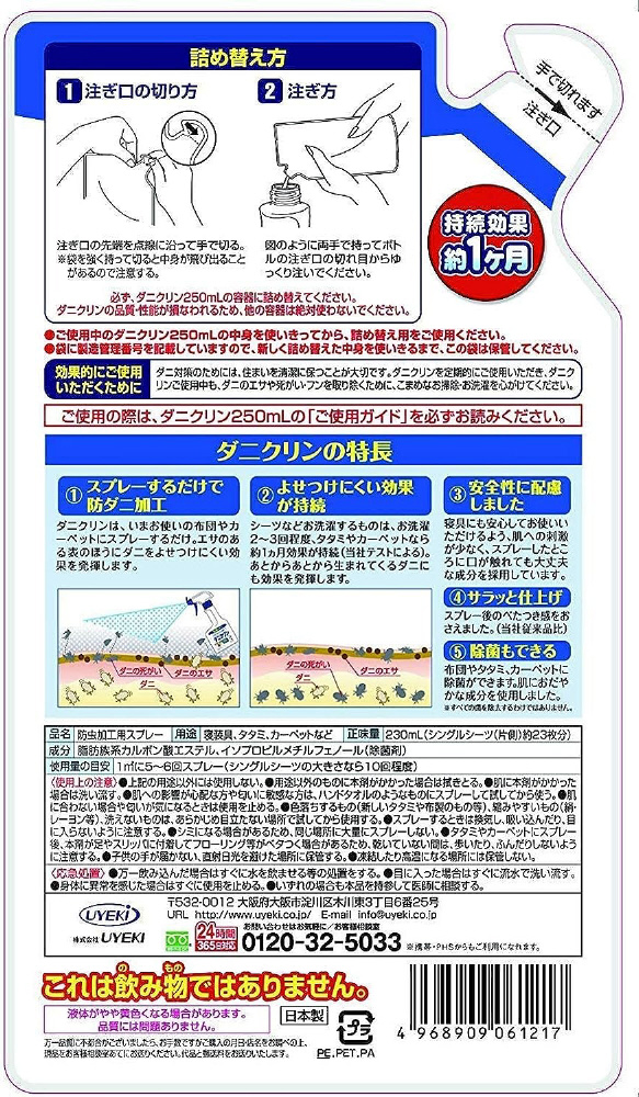 | 商品名 | ダニクリン 除菌タイプ つめかえ用 230mL |