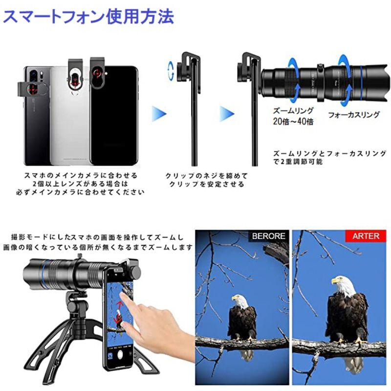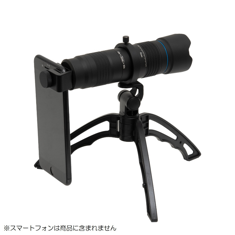 スマートフォンでの撮影に対応した、倍率20倍〜40倍のスーム単眼鏡です。付属のアダプターにスマホをしっかりと固定し、望遠レンズとして撮影することが可能です。もちろん、付属のアイカップを取り付け、通常の単眼鏡としても活躍します。登山やバードウォッチングなどの野生観察や植物観察などのアウトドアシーンをはじめ、旅行、スポーツ観戦、天体観測など幅広い用途で活躍できます。プリズムは屈折率の高く高品質なK9光学ガラスを採用し、アルミ製ボディで耐久性に優れています。スタイリッシュな細身の筐体となっており屋外への持ち運びも容易です。付属の三脚は簡易的な三脚となるため、よりしっかりとした撮影を好まれる場合は、別途三脚をご用意いただくことをお勧めします。