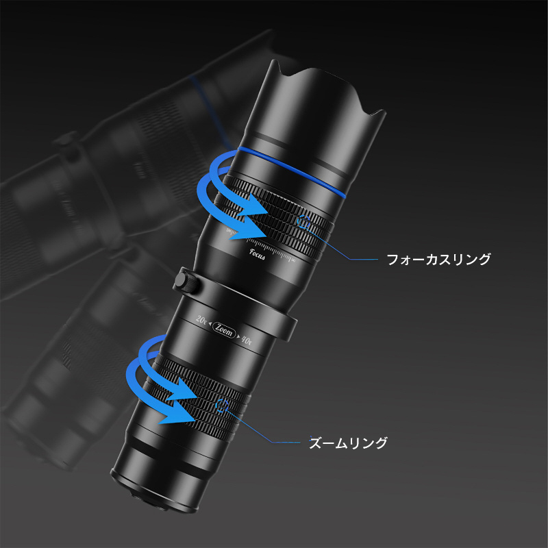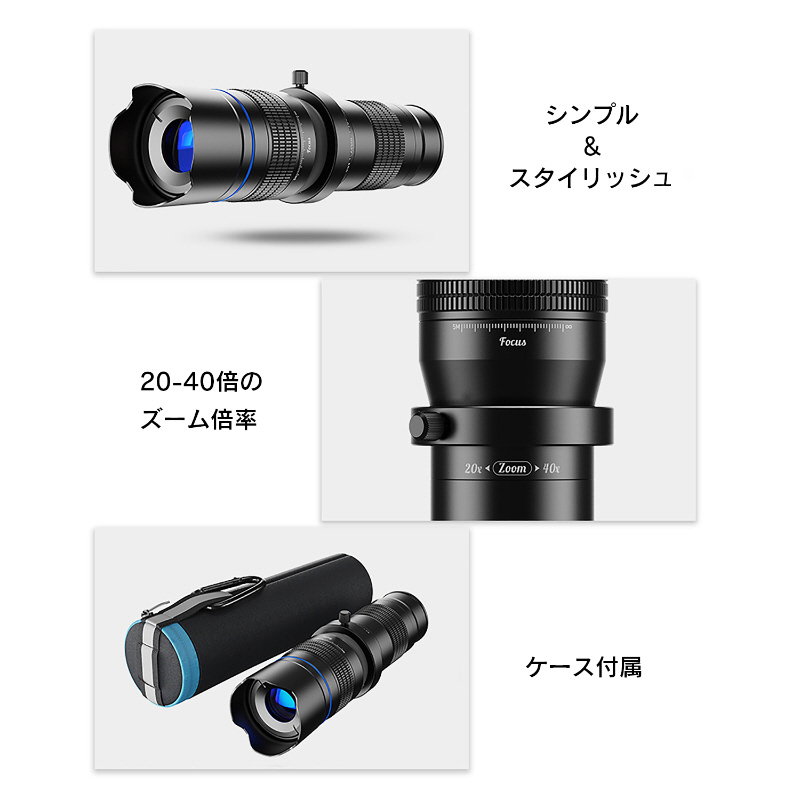 スマートフォンでの撮影に対応した、倍率20倍〜40倍のスーム単眼鏡です。付属のアダプターにスマホをしっかりと固定し、望遠レンズとして撮影することが可能です。もちろん、付属のアイカップを取り付け、通常の単眼鏡としても活躍します。登山やバードウォッチングなどの野生観察や植物観察などのアウトドアシーンをはじめ、旅行、スポーツ観戦、天体観測など幅広い用途で活躍できます。