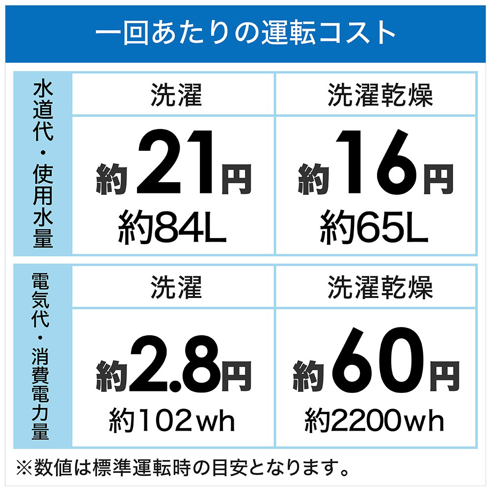 消費電力量 洗濯 102/100Wh、 洗濯 ? 乾燥 2200/2100Wh