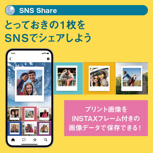 スマホの画像をスクエアフォーマットのチェキフィルムに出力できるスマホプリンター。AR(拡張現実)エフェクトでチェキプリントを彩る機能や、メッセージ付きチェキプリントで離れた相手ともタイムリーにリアルな繋がりを楽しめる機能を搭載しています。