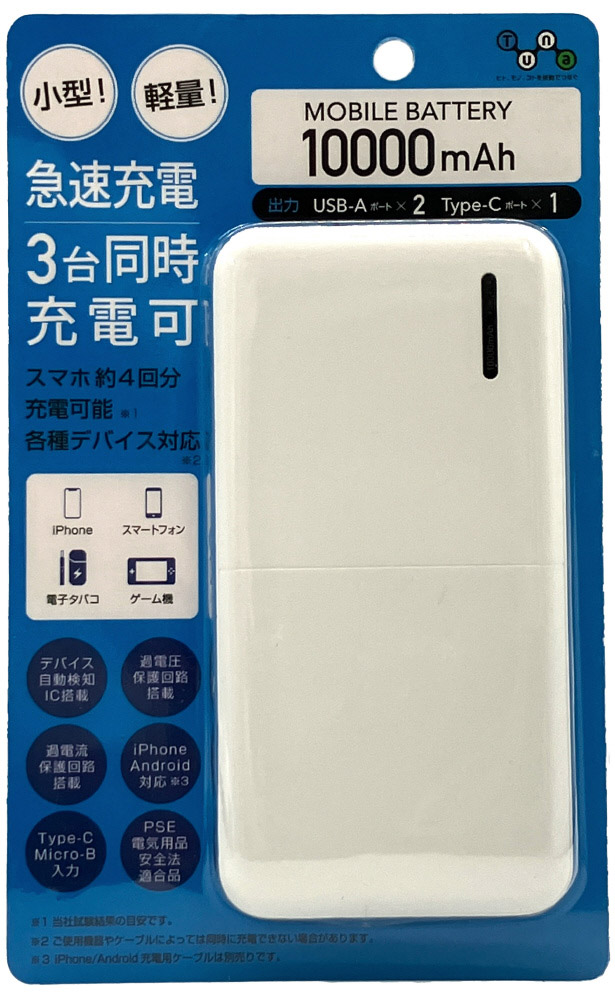 小型・軽量サイズ モバイルバッテリー10000mAh 3台同時に充電可能