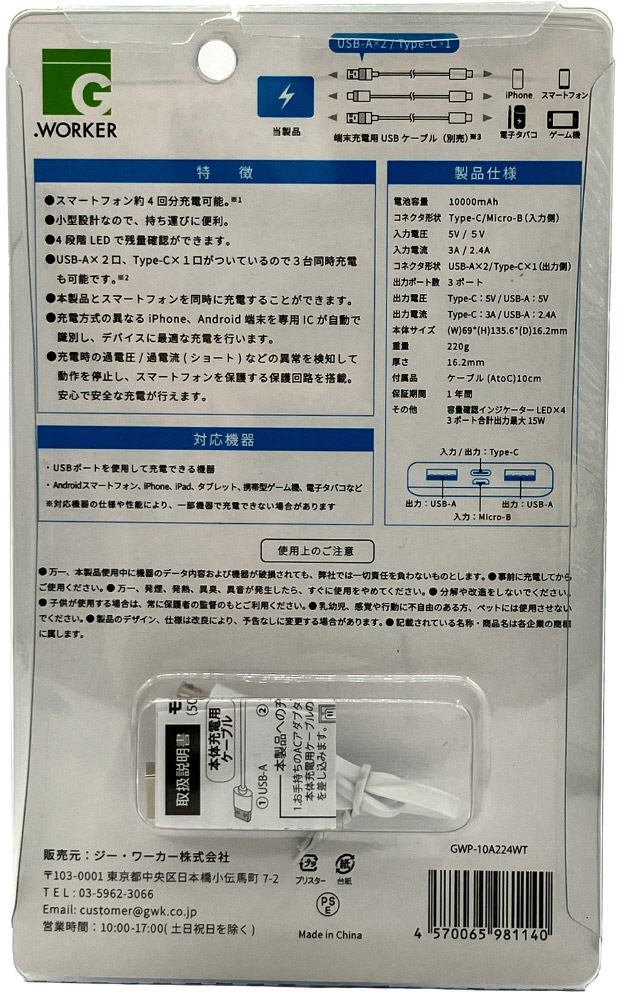 モバイルバッテリー 小型・軽量サイズ ホワイト GWP-10A224WT [3ポート] 【sof001】