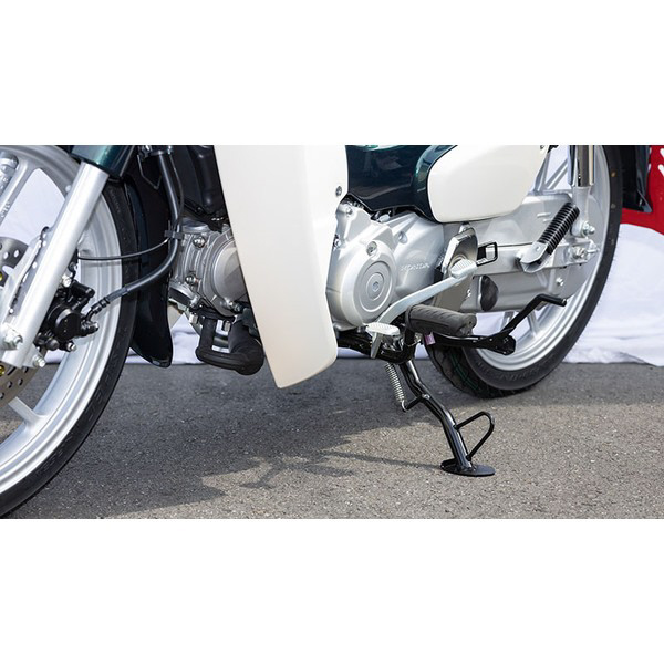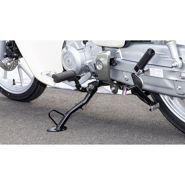 通勤・通学やだけでなく業務やキャンプツーリングで活用されることが多いスーパーカブ110ですが、多くの荷物積載時に純正サイドスタンドでは緩い地盤や荷物満載時に駐輪をする際、転倒してしまう危険性が有ります。