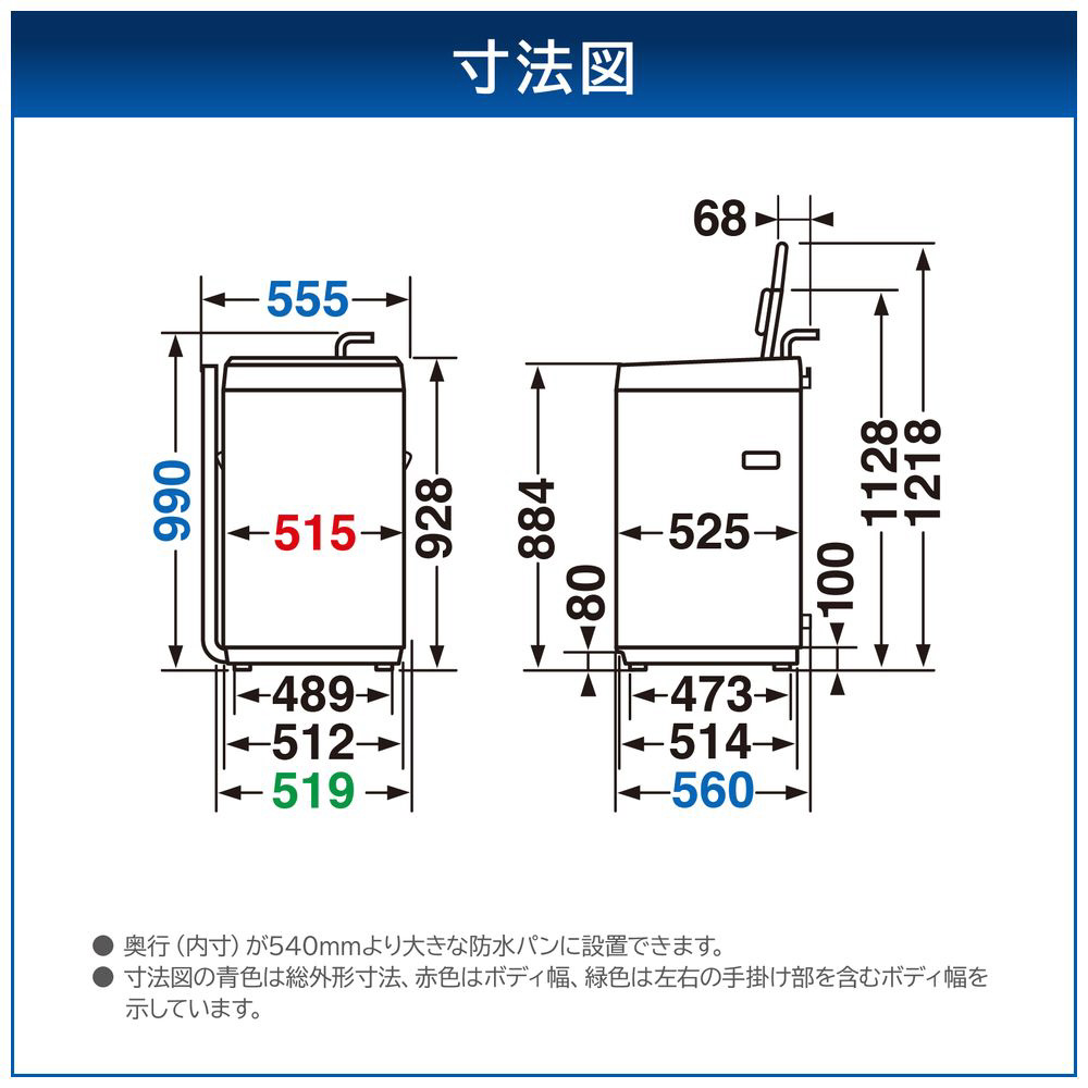 | 設置可能防水パン | 奥行内寸法 540mm以上 |