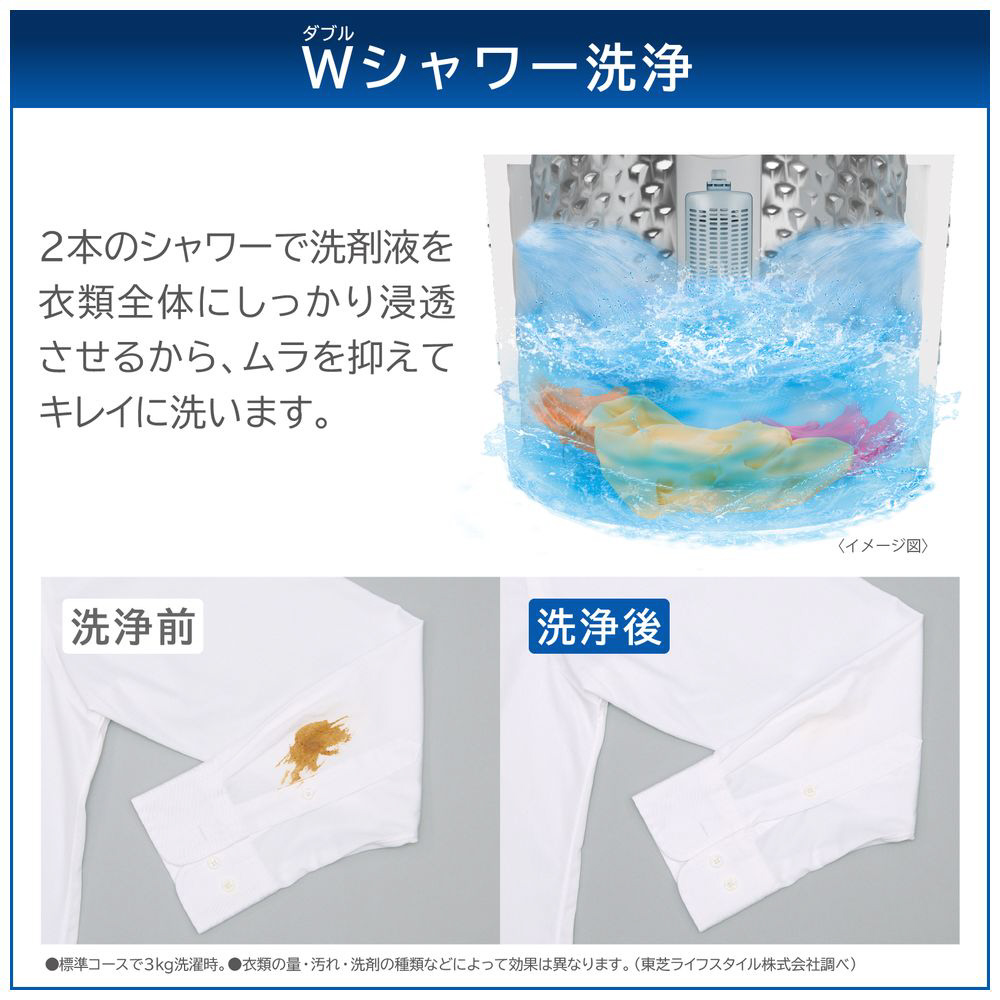 東芝の全自動洗濯機AW-5GA2-WはWシャワー洗浄でしっかり洗う!