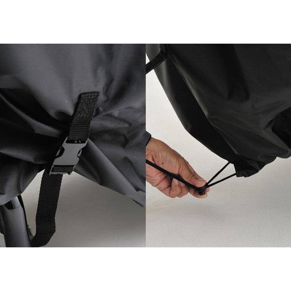 車体中央下部のワンタッチベルトと前後絞りひもでカバーが風で飛んでいく心配がない。