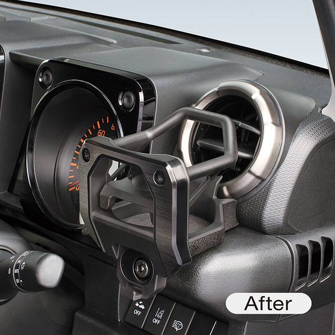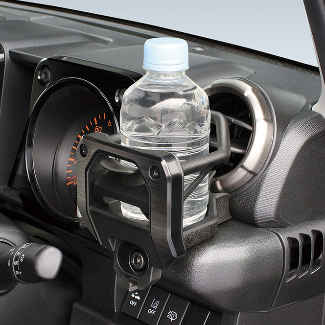 ジムニー・ジムニーシエラ(JB64/74)の右ハンドル車の運転席側サイド吹出し口下のパネルに取り付けできるドリンクホルダーです。