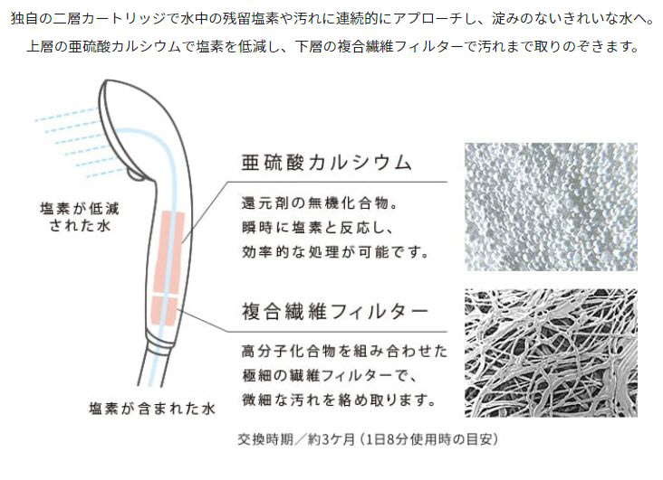 上層の亜硫酸カルシウムで塩素を低減し、下層の複合繊維フィルターで汚れまで取りのぞきます。