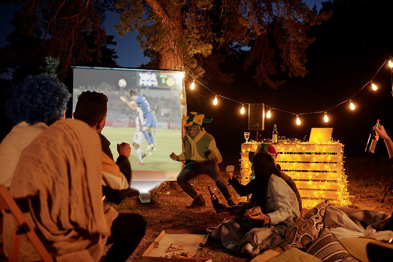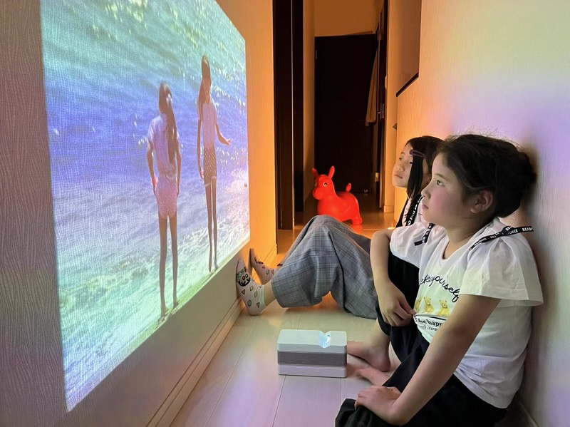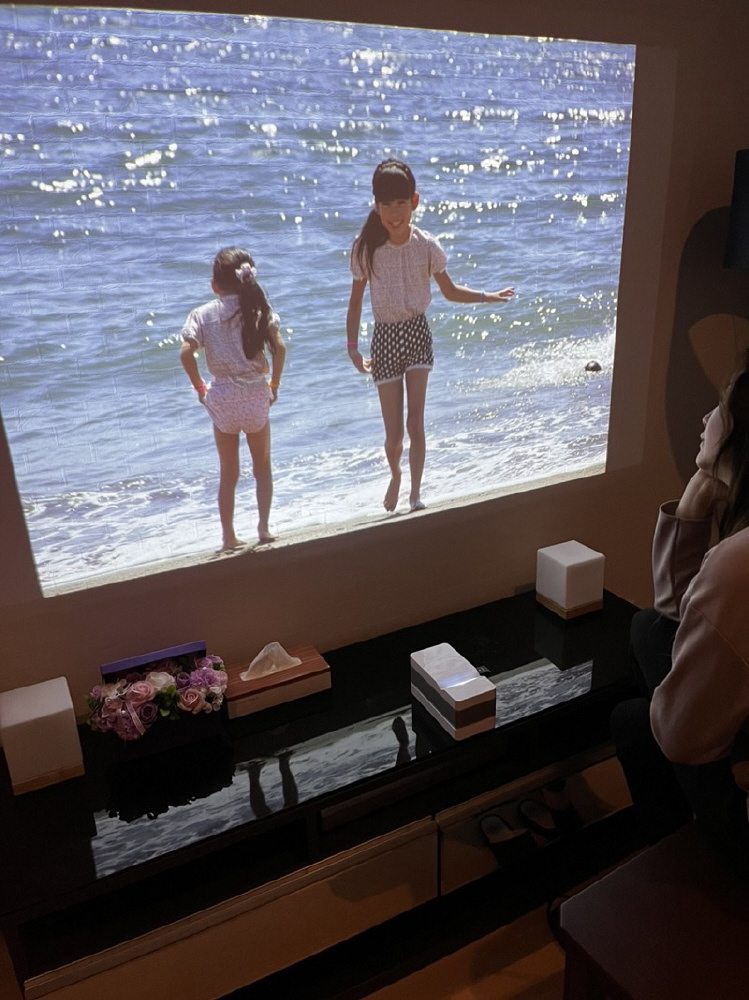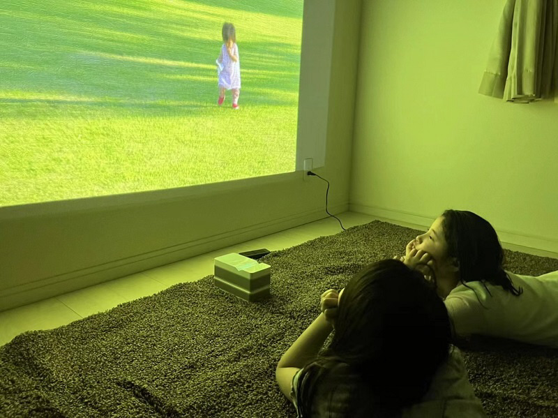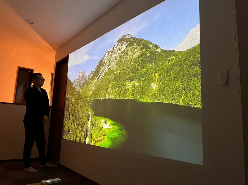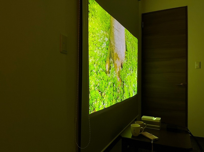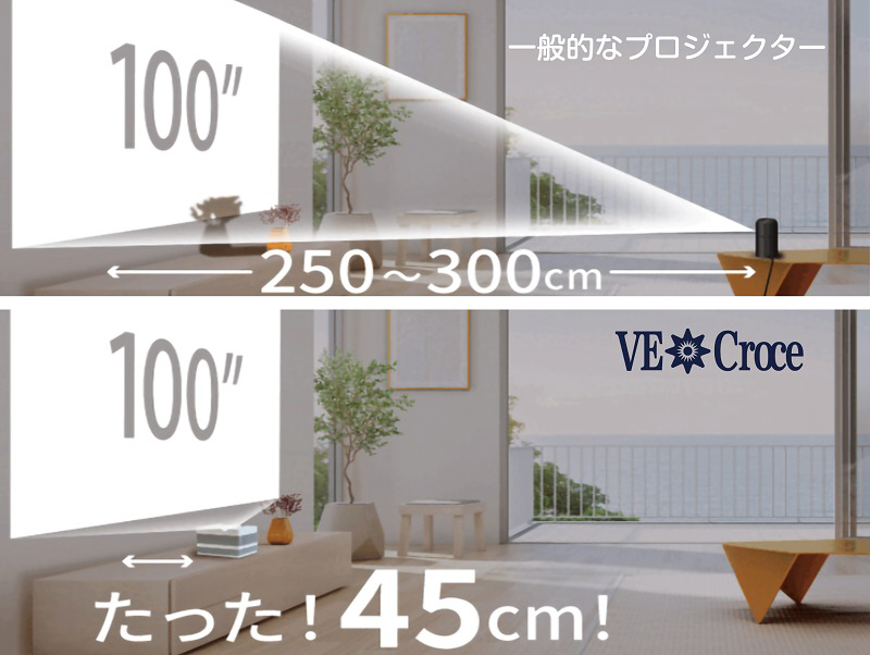 憧れの100インチを壁からたった45cmで実現。壁からプロジェクターまでの距離が近いから、自分の影も映らず大画面で視聴可能。だから実現できた圧倒的な没入感!VE・Croceは場所を選ばずいつでもどこでも迫力の大画面をお楽しみいただけます。
