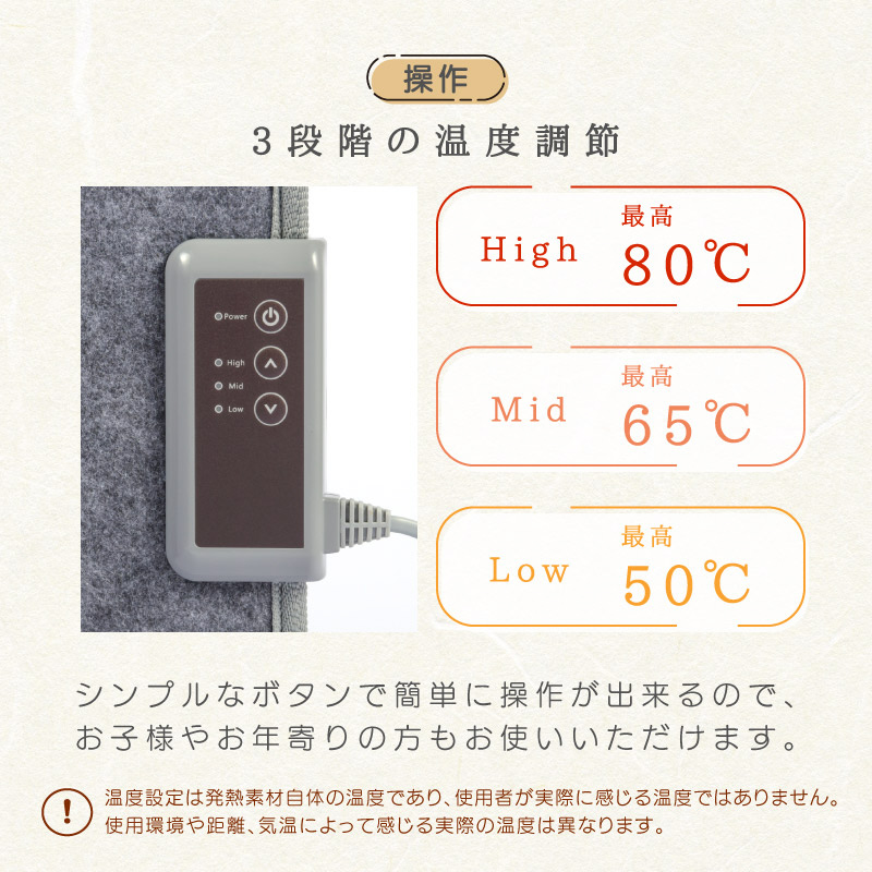 ■シンプルなボタン操作で、3段階の温度調節が可能です。