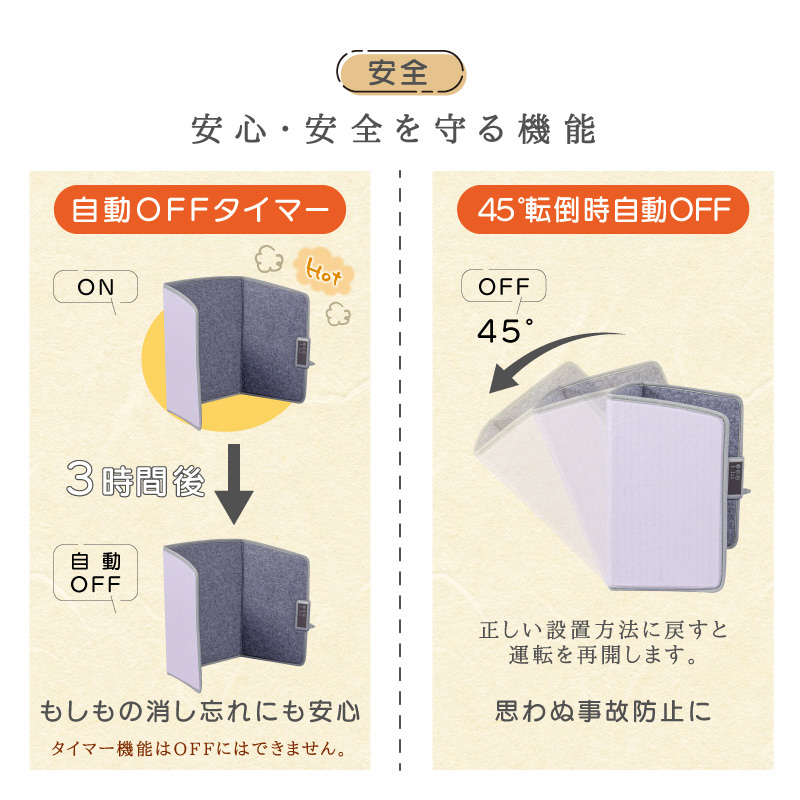 ■連続3時間使用した場合、自動で運転がOFFになります。もしもの消し忘れにも安心!