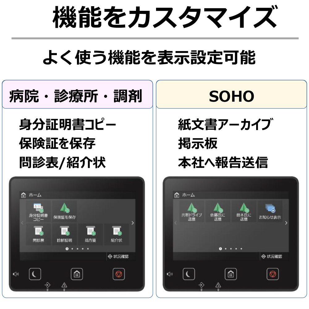 ・定型業務をワンボタンに集約し、本体パネルから簡単に実行できる「アプリケーションライブラリ」を搭載。「定型文書プリント」、「固定宛先スキャン」など合計17種類のアプリケーションを用意。ホーム画面をタブ化し、使う人や用途に合わせたカスタマイズも可能。