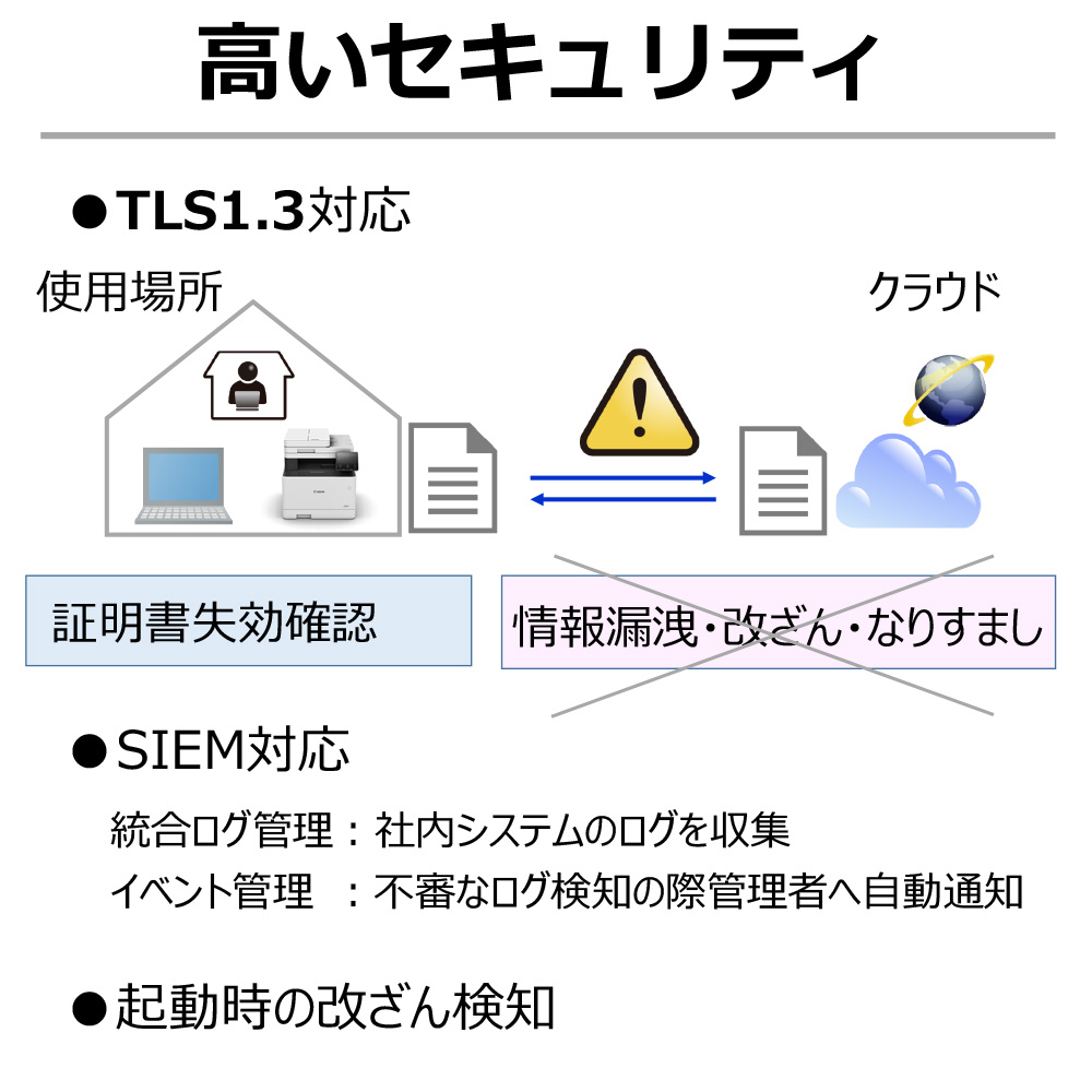 ・通信の強固な暗号化プロコトル「TLS1.3」、不正アクセスを防止する「IEEE802.1X」の規格に対応しており、ネットワーク上のデータ保護とクラウドへのセキュアな接続を実現。