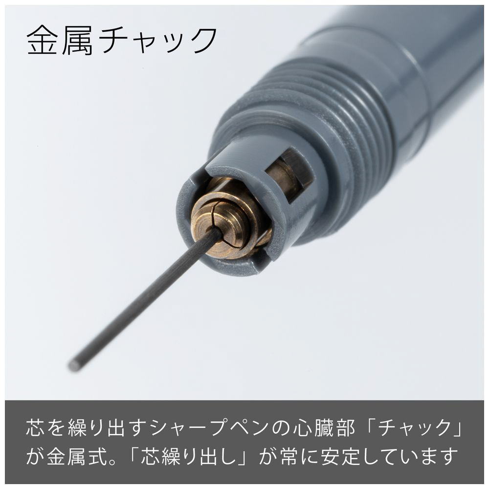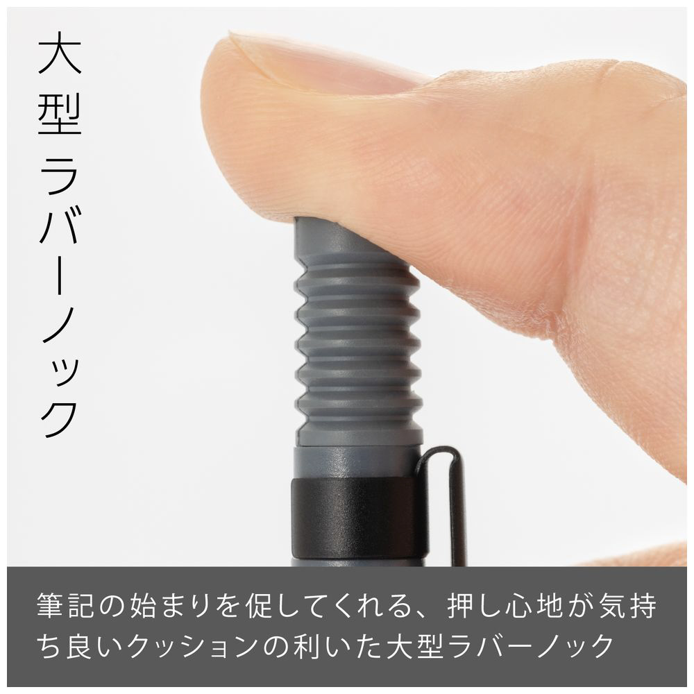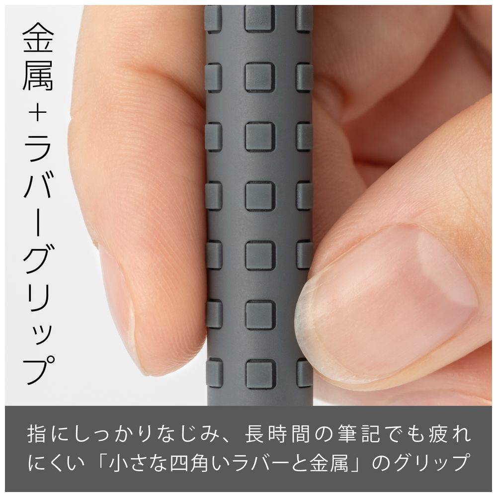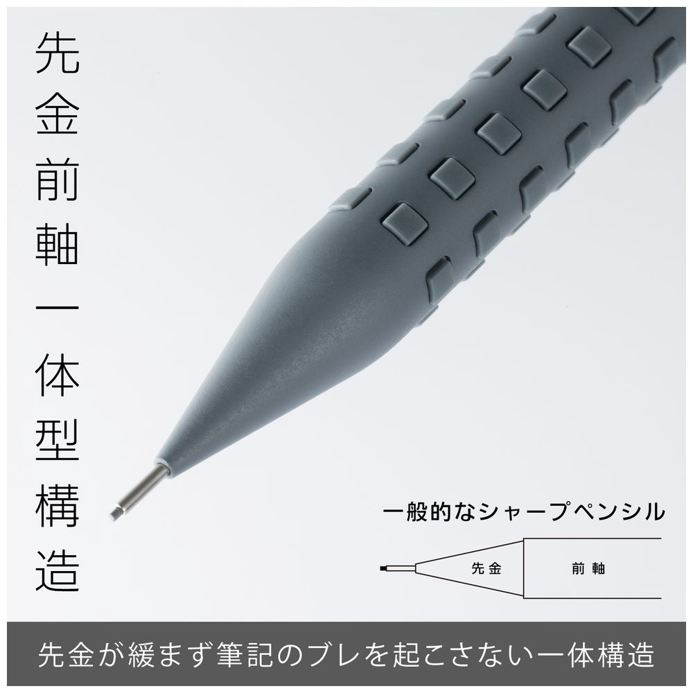 先金・前軸一体構造でブレない安定した書き心地。手になじみ、しっかり握れる金属×ラバーグリップ。芯硬度表示窓付き。 大型ラバーノック。