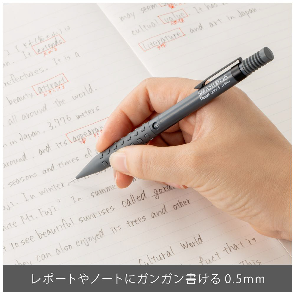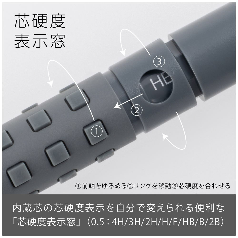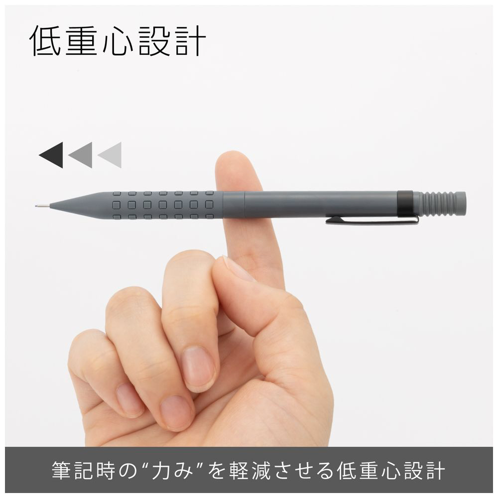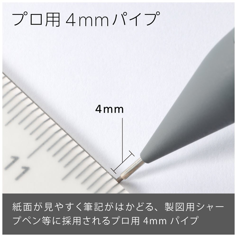 先金・前軸一体構造でブレない安定した書き心地。手になじみ、しっかり握れる金属×ラバーグリップ。芯硬度表示窓付き。 大型ラバーノック。