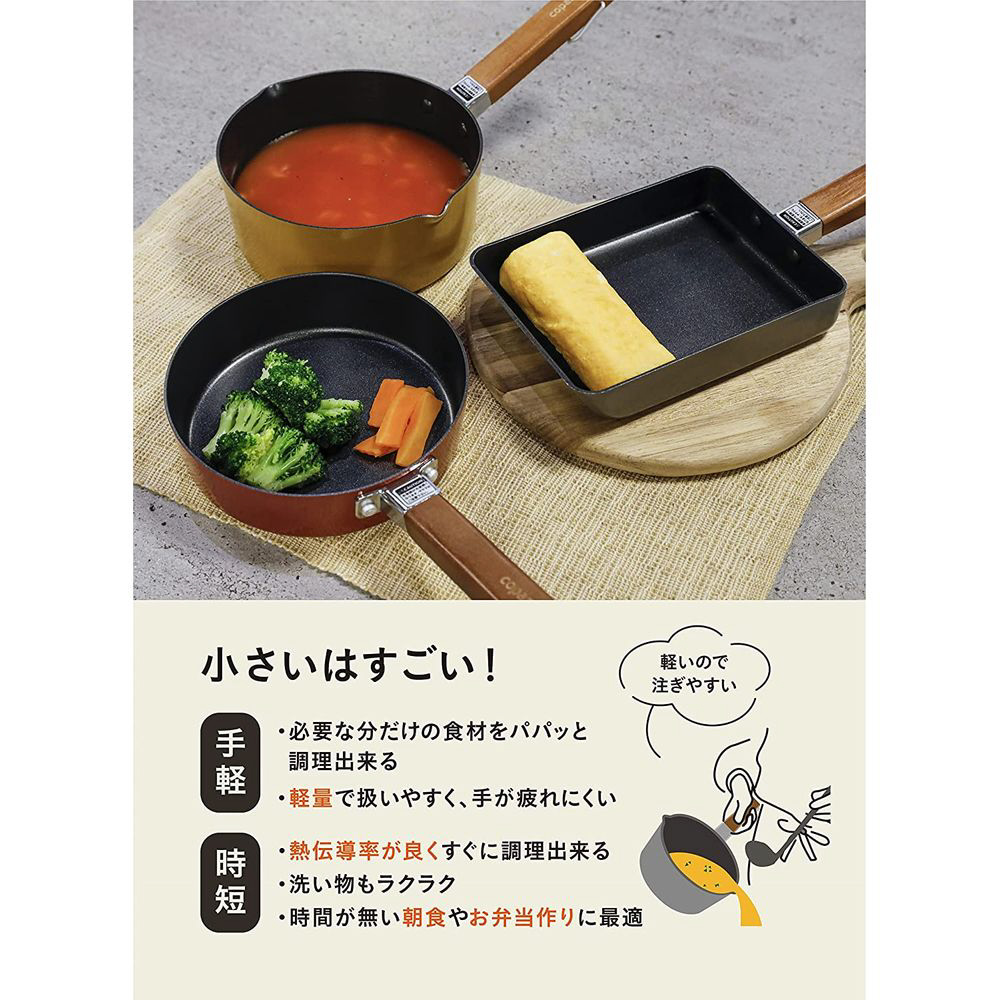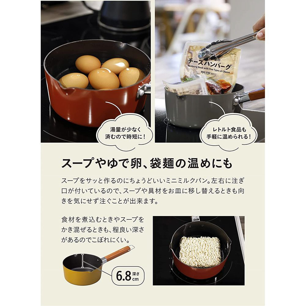 IH対応の小型ミルクパンで、スープ作りに最適です。深さがあるのでこぼれにくく、両側に注ぎ口付きで注ぎやすい設計です。ふっ素加工で汚れが落ちやすく、軽量で扱いやすいのが特徴です。