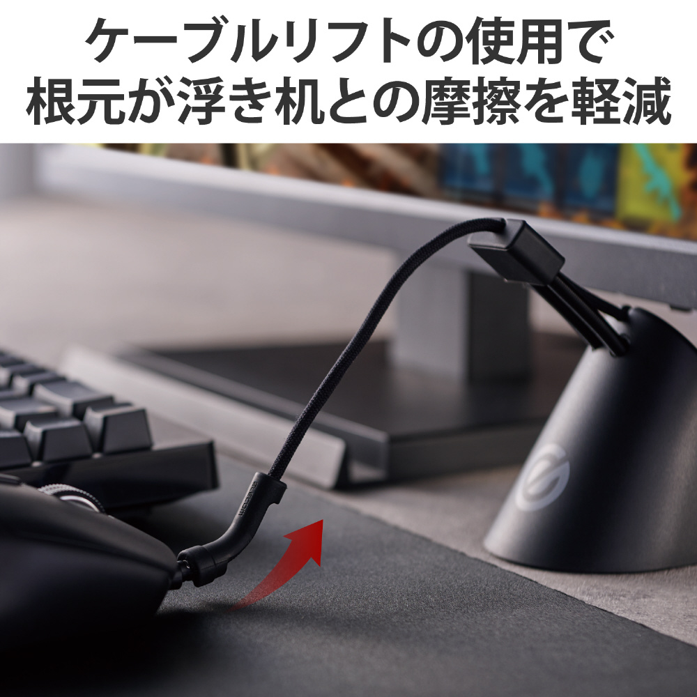 ■ケーブルリフトをマウスケーブルに装着することで、ケーブルの根本を浮かせ、机との摩擦を軽減します。