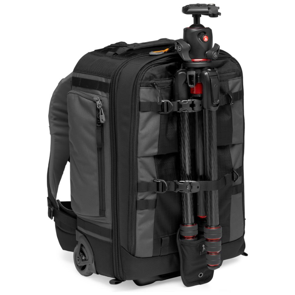 ・バッグ前面、もしくは側面に三脚の取付けが可能。15インチのノートPCと10インチのタブレット収納スペースあり。バッグ内側と外側に小物の収納に便利なポケットが豊富。アダプタやケーブルなどを収納するのに適したギアボックスが付属。